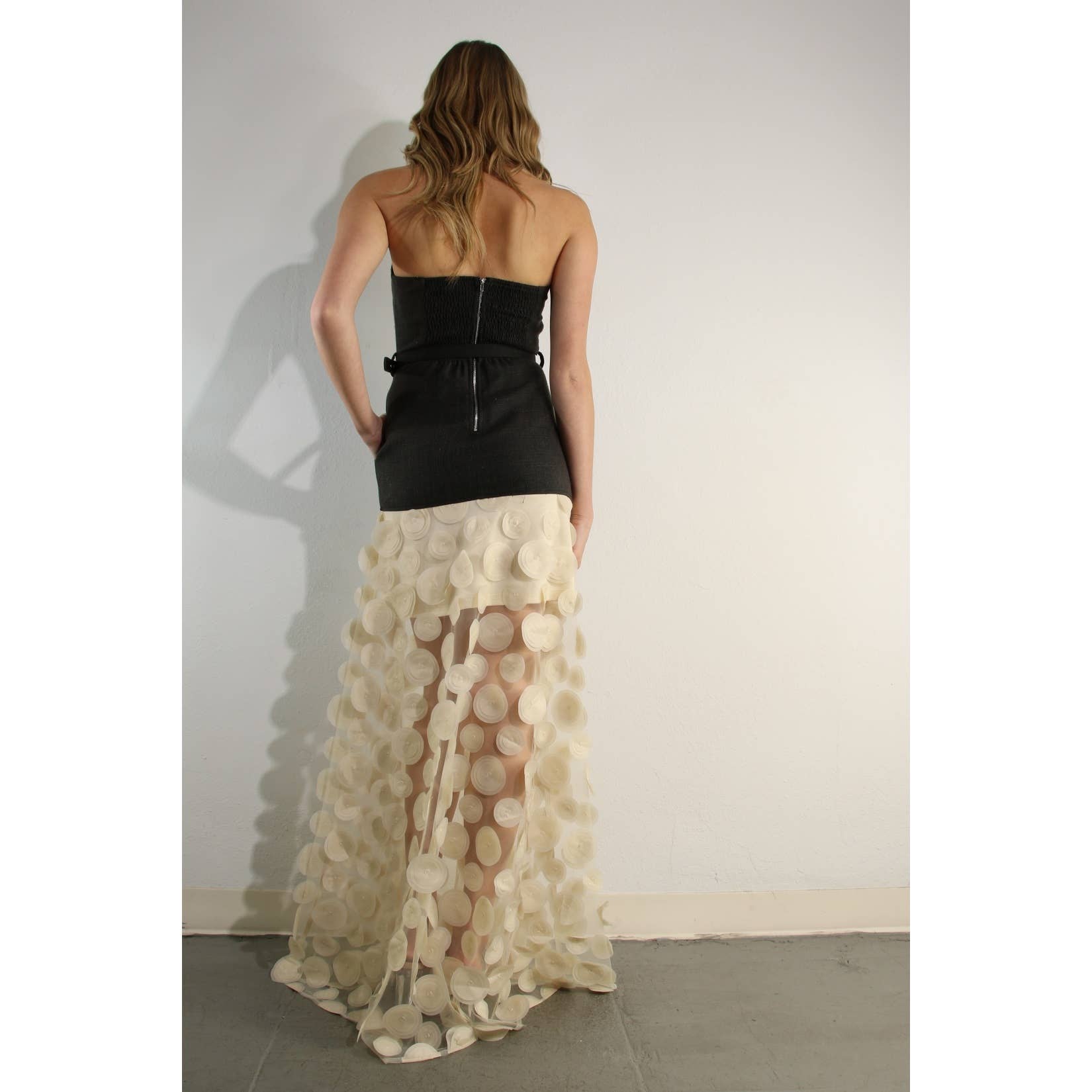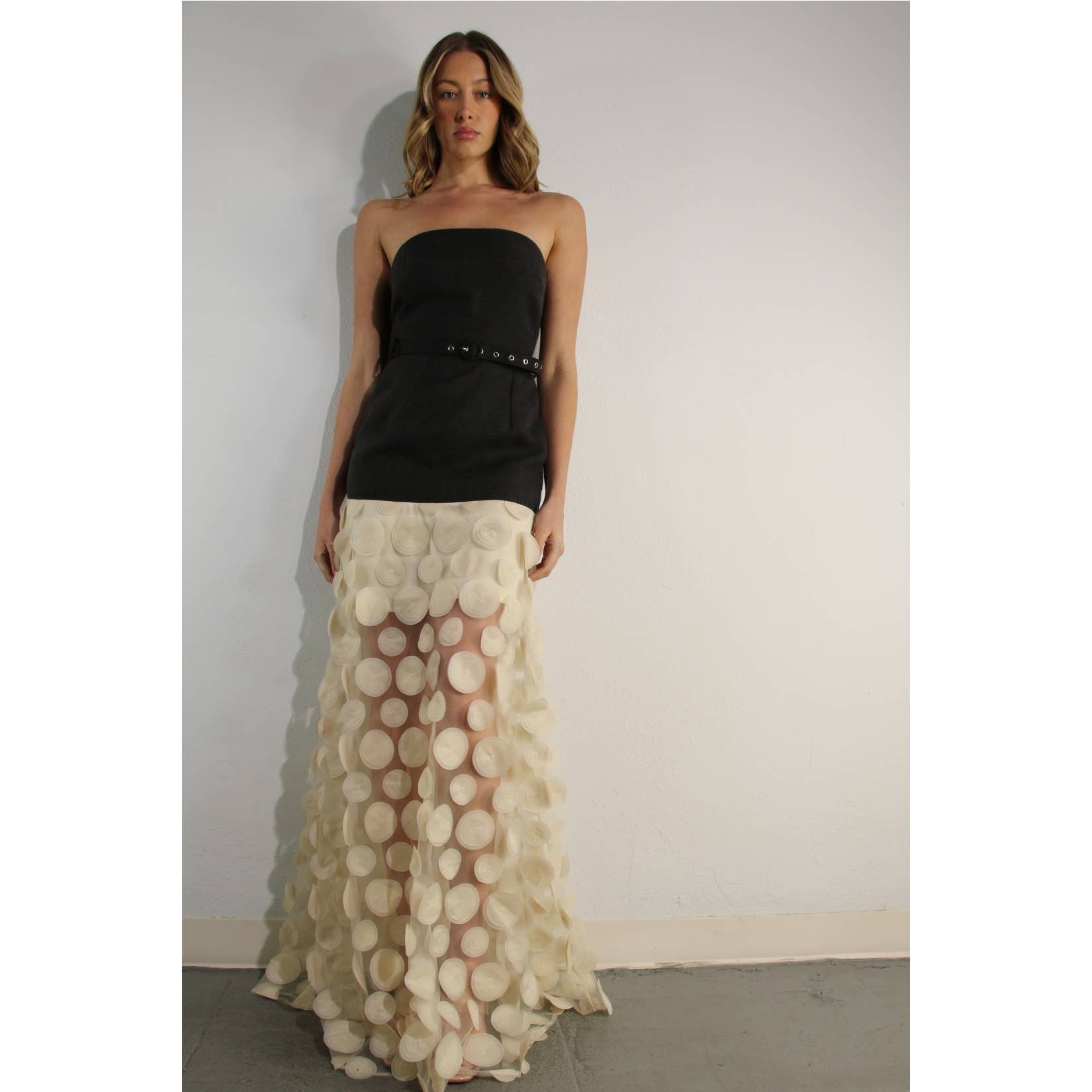 A daring fusion of structure and artistry, this strapless gown contrasts a sleek black bodice with a sheer ivory skirt adorned in three-dimensional circular appliqués. The belted waist adds definition, while the translucent hemline creates a captivating play of light and shadow. Perfect for high-fashion evenings, red carpet moments, or any event where avant-garde elegance takes center stage. 70%POLYESTER 30%LINEN